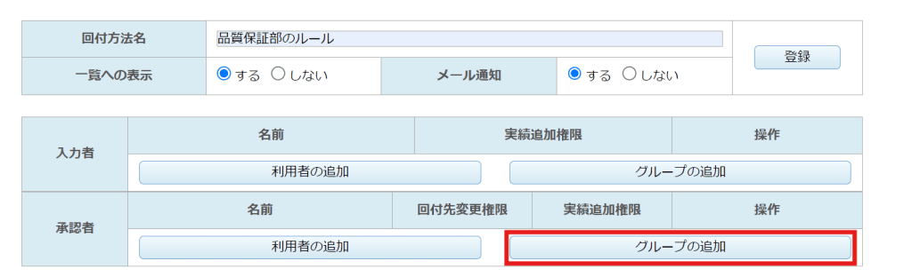 回付方法の作成時において、承認者にグループの指定ができるように対応しました。